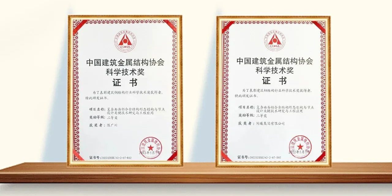 大会对2022年中国建筑金属结构协会科学技术奖予以表彰,同曦集团董事长陈广川主导申报的“复杂曲面铝合金结构形态创构与节点设计关键技术研究与工程应用”项目,荣获“2022年中国建筑金属结构协会科学技术二等奖”。